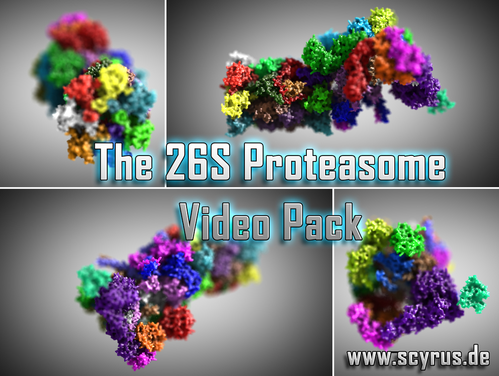 You get two sets of beautiful rendered animations (1920x1080 pixels, looped, MPEG-format, 30 seconds, each) including 39 videos overall, that are synchronized an can be crossfaded to show different aspects of the 26S proteasomal structure- useful for scientific lectures and education.